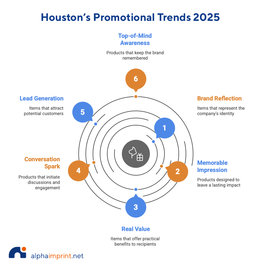 The most popular promotional items Houston this 2025 are: 1. Custom Insulated Tumblers, 2. NFC-Enabled Keychains, 3. Branded Tote Bags, 4. Wireless Charging Pads, 5. Eco-Friendly Notebooks, 6. Portable Bluetooth Speakers, 7. Smart Water Bottles, 8. Desk Plants, 9. Custom Hoodies, and 10. Interactive Event Wristbands.