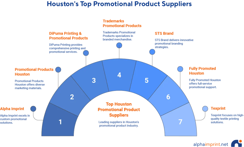 This 2025, the top promotional companies in Houston are: 1. Alpha Imprint, 2. Promotional Products Houston, 3. DiPuma Printing & Promotional Products, 4. Trademarks Promotional Products, 5. STS Brand, 6. Fully Promoted Houston, and 7. Texprint.