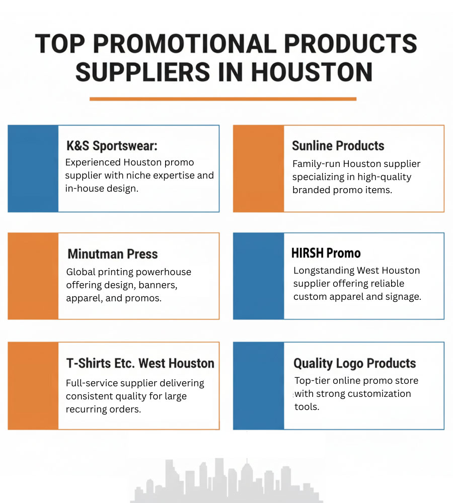 This 2025, the top companies providing promotional products Houston businesses trust are: 1. Alpha Imprint, 2. K&S sportswear, 3. Minuteman Press, 4. Sunline Products, 5. HIRSCH Promo, 6. T-Shirts Etc. West Houston, and 7. Quality Logo Products.